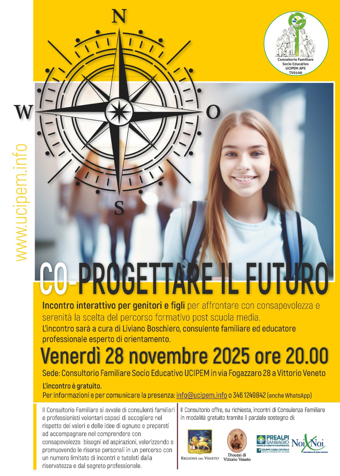 Si terrà venerdì 28 novembre alle ore 20:00 presso la sede del nostro Consultorio, in via Fogazzaro 28 a Vittorio Veneto, l’incontro “CO-PROGETTARE IL FUTURO”, con l’intento di affiancare genitori e figli nella scelta del percorso formativo dopo le scuole medie.