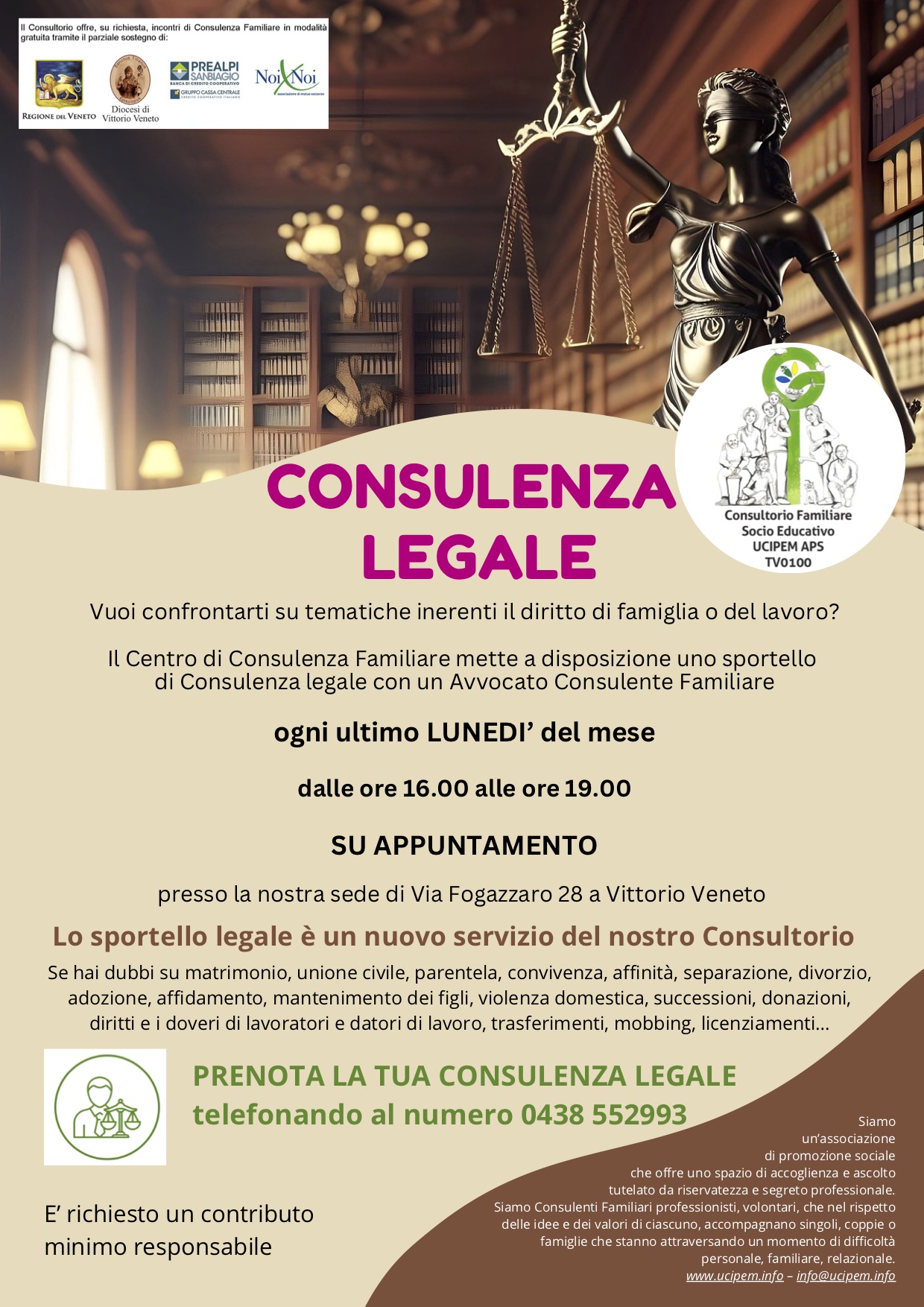 Il Consultorio Familiare Socio Educativo UCIPEM CFSE di Vittorio Veneto amplia i propri servizi con l’attivazione di un nuovo sportello di Consulenza Legale, dedicato a chi desidera un confronto su questioni giuridiche che possono riguardare la vita personale, familiare o lavorativa. Il servizio, tenuto da un Avvocato Consulente Familiare, sarà disponibile ogni ultimo lunedì del mese, dalle ore 16.00 alle ore 19.00, su appuntamento.