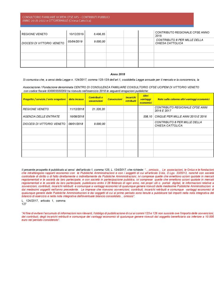 In ottemperanza a quanto stabilito dalla Legge 04/08/2017 – art.1, commi 125-129, ai fini della trasparenza e della pubblicità, si pubblicano le informazioni relative a sovvenzioni, contributi, incarichi retribuiti e comunque di vantaggi economici ricevuti nell’anno 2018 da parte degli Enti Pubblici con importi nel periodo considerato complessivamente superiori a Euro 10.000,00.